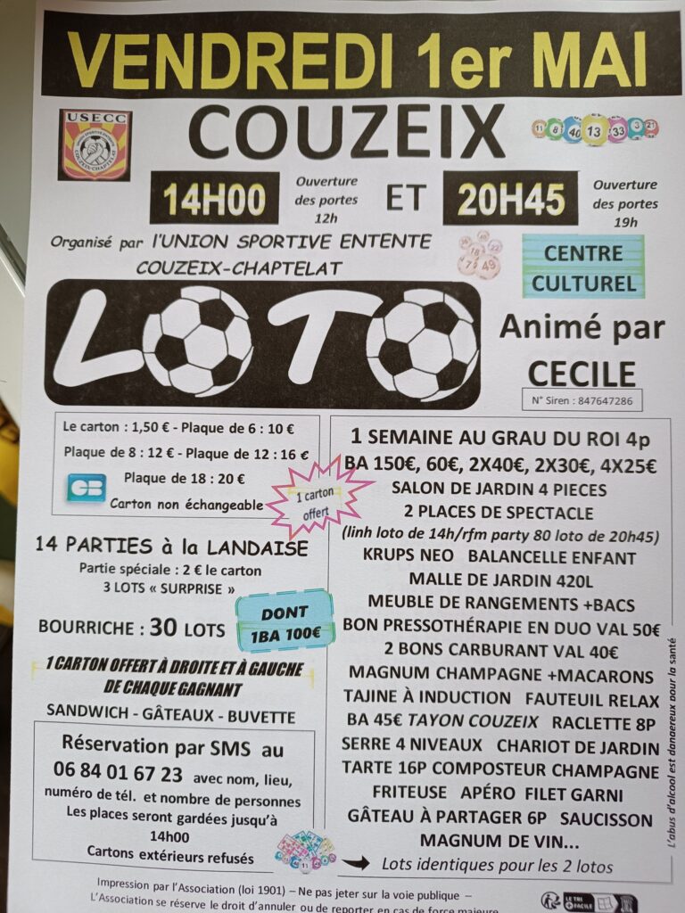 Grand Loto à Couzeix Vous n'avez rien de prévu pour la Fête du Travail ? Venez tenter votre…